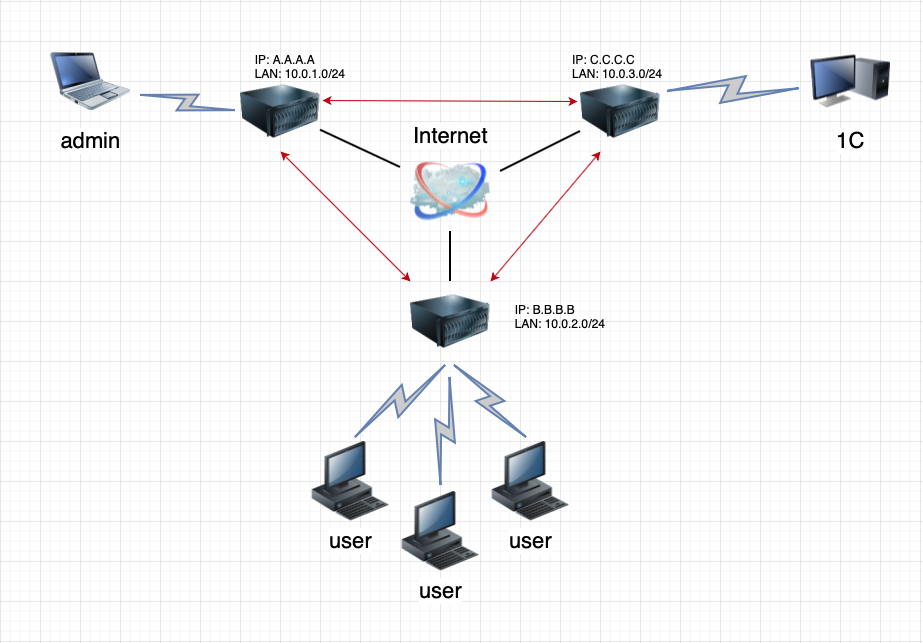 - сервер B ( офис): определенным компьютерам нужно предоставить доступ к компьютеру с 1С, который стоит в другом офисе;